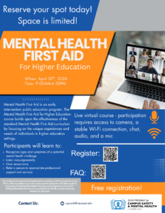 Mental Health First Aid is an early intervention public education program. The Mental Health First Aid for Higher Education course builds upon the effectiveness of the standard Mental Health First Aid curriculum by focusing on the unique experiences and needs of individuals in higher education settings.