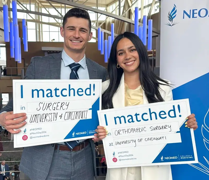 Match Day 2026 brought double the joy for two Northeast Ohio Medical University students whose personal and professional journeys joined together at the University. Maximilian “Max” Dawson, of Youngstown, and Emily Arellano, of Wadsworth, first met at NEOMED—then fell in love while navigating the challenges of medical school together. On Friday, March 20, their hopes for the future became reality as they opened their envelopes and discovered they had both matched at the University of Cincinnati Medical Center.