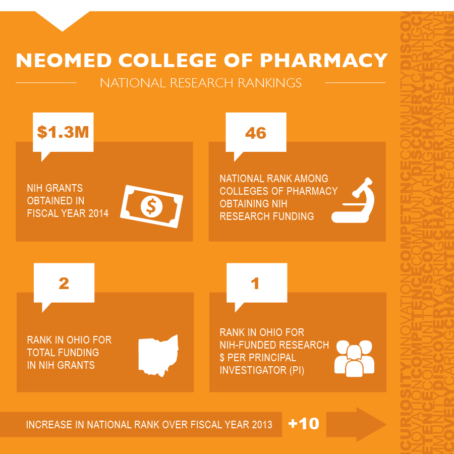NEOMED’s College of Pharmacy reported about $1.3 million in NIH grants for the government’s fiscal calendar ending Sept. 30, 2014, ranking it second in Ohio based on total funding behind The Ohio State University. NEOMED’s College of Pharmacy jumped more than 10 spots from last year’s rankings, surpassing the other Colleges of Pharmacy in the state.