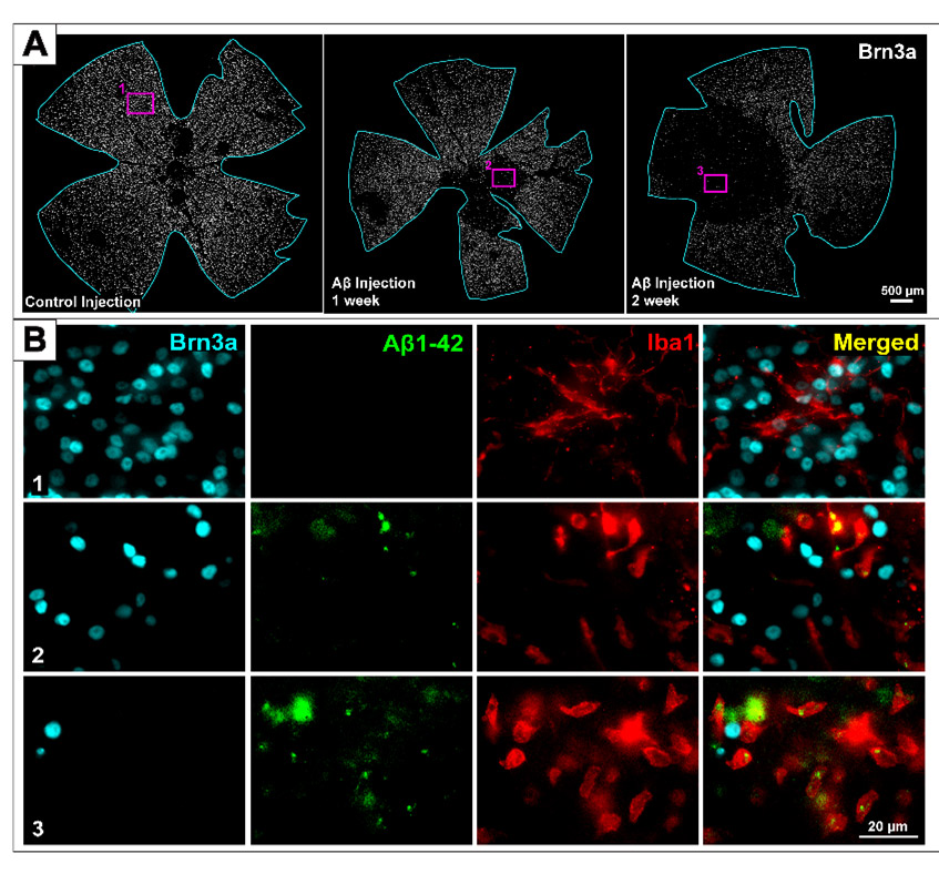 Below is an example of how injected Aβ kills retinal ganglion cells (RGC; white dots). Note the large areas of retina that have lost RGCs after Aβ injection. Below are fluorescent images of the retina showing Aβ being taken up by cells of the retina.